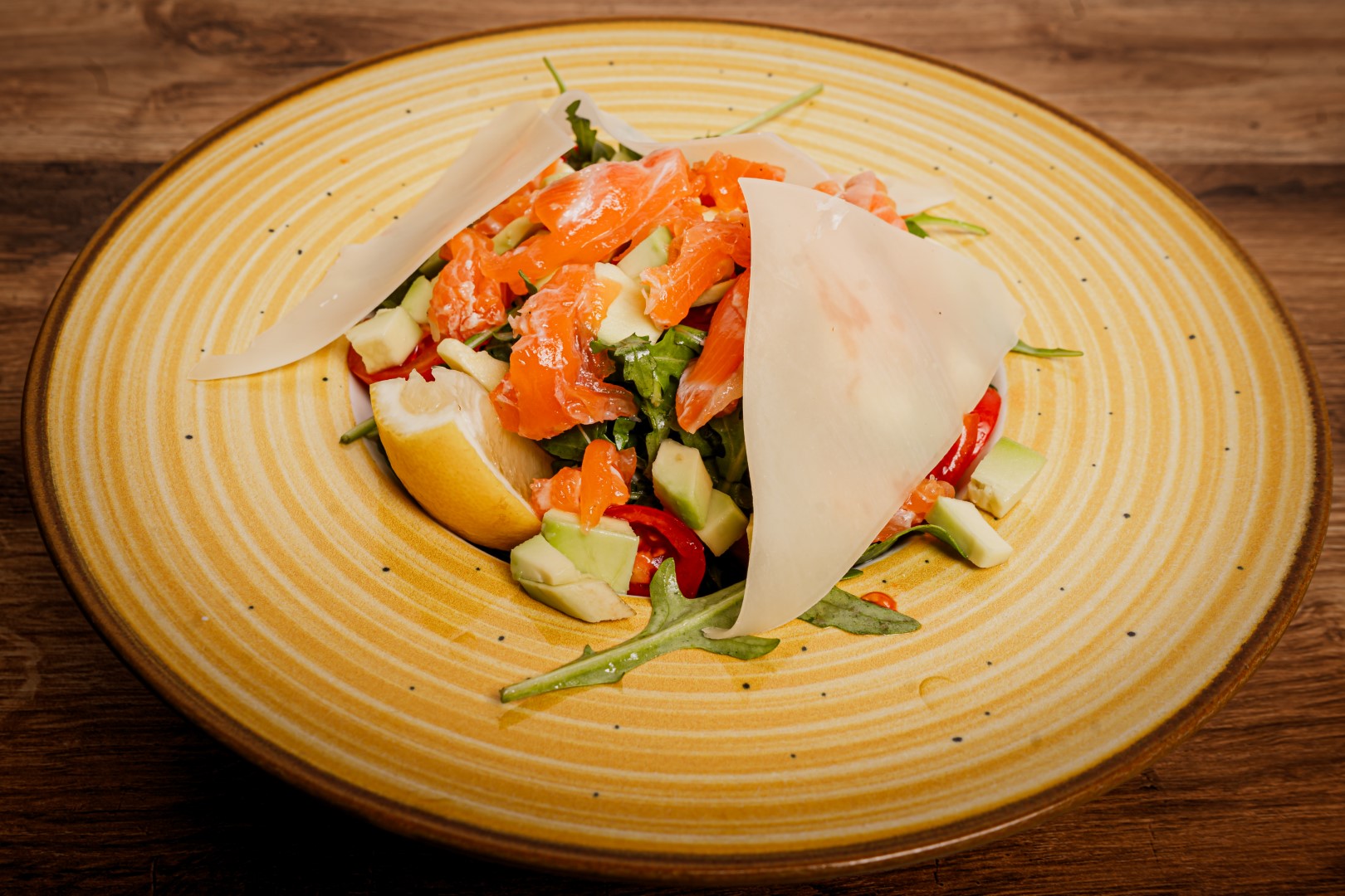 Rucola,somon marinat in casa,avocado parmezan,rosii cherry,ulei de masline,lamaie